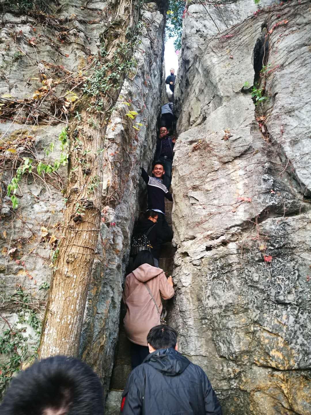 有階石五十三級,取佛教“五十三參,參參見佛”之意。一線天通山頂。明人沈伯英<一線天>詩云:“須臾盤折出木杪,如晦而臥日方曉。人生休歌引路難,歷盡崎嶇見坦道。